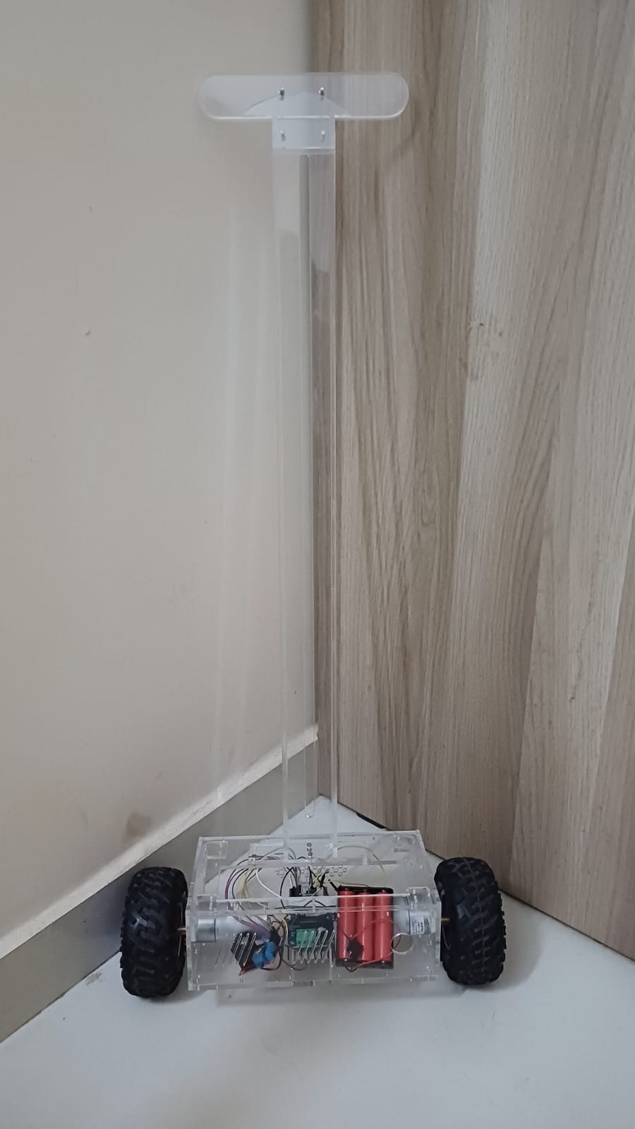 A differential-drive walker with two powered wheels, an assistive handle (pole), and a simulated IMU sensor. Designed for research in stabilization, navigation, and user-adaptive control.